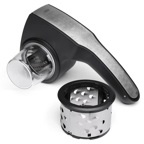 Take this Rotary Grater. Made in the classic cheese-grater design with a modern edge, this grater features two interchangeable drums for fine and coarse grating. Far from just grating cheese, this handy device, with its sharp laser-cut design, will also take care of chocolate and nuts without breaking a sweat.