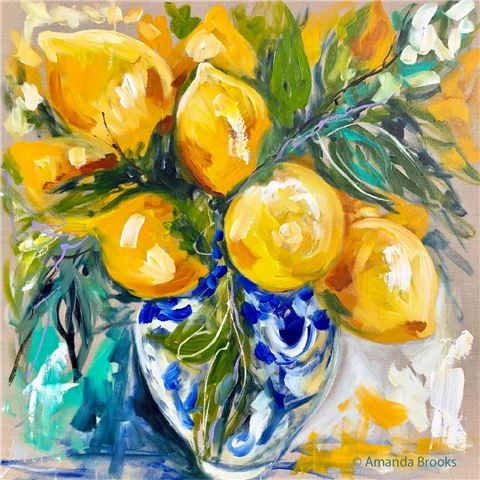 - Shows a vase of ripe lemons