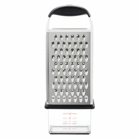 Oxo’s Good Grips Box Grater features four stainless steel surfaces – two wide ones for coarse and medium grating and two slimmer ones for fine grating and slicing. A convenient container with non-slip base, measurement markings and lid attaches to the bottom for catching and storing freshly grated ingredients.
